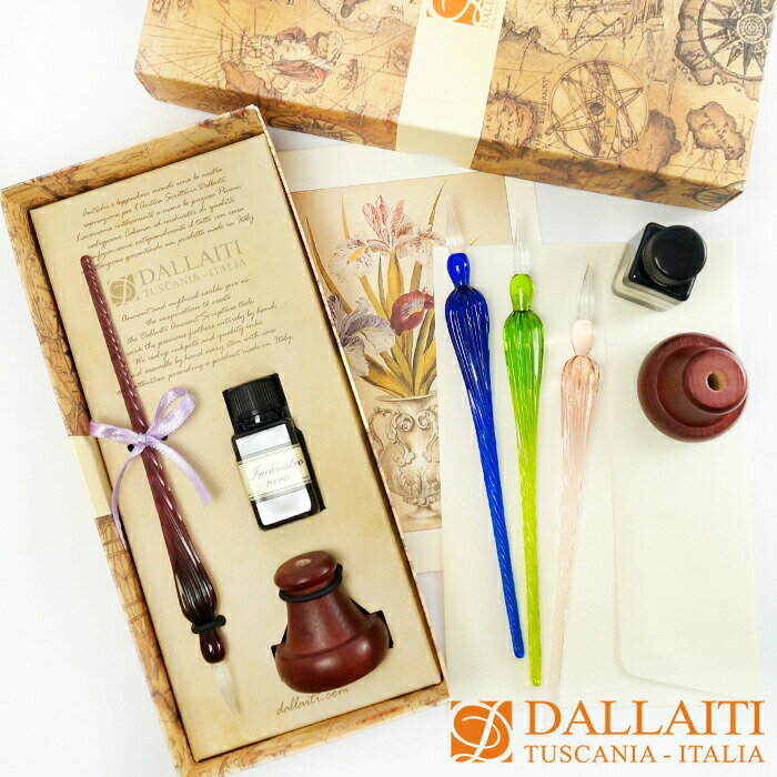 商品名DALLAITI ガラスペン スタンド+インクセット BX63 (カラー:セピア/グリーン/パープル/ブルー/ボルドー)大きさ・インク量ガラスペン:長さ約18cm スタンド:高さ約3.5cm インク(カラー:ブラック):18ml生産イタリア製 HAND MADE IN ITALY商品説明手になじみ、持ちやすい形のガラスペン。