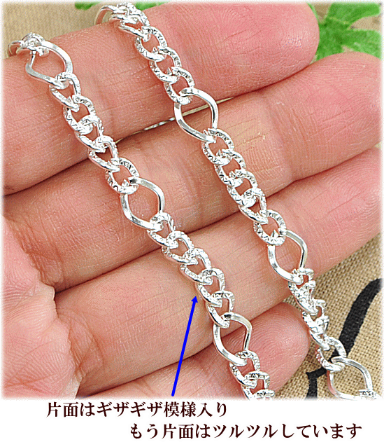 )フィガロチェーン ホワイトシルバー約1m片面に模様が入った、存在感のあるチェーンアクセサリーやストラップ、キーホルダー作りに・・・↓商品は異なりますが、ご参考に↓ 【作り方】1.チェーンの端にキーホルダーをつけます。